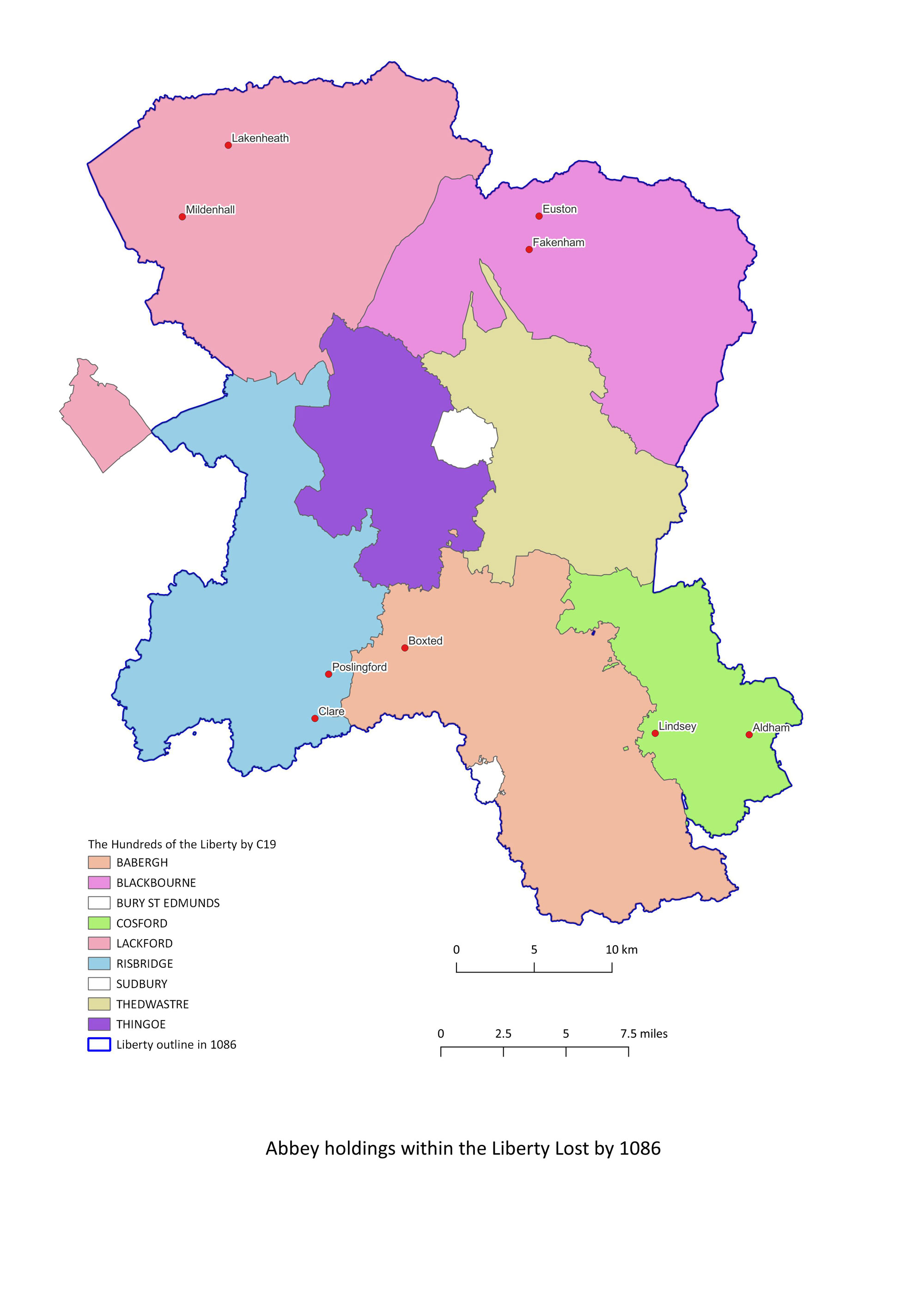 Held in 1086Holdings of the Abbey of St Edmund in 1086 - Inside the Liberty of St Edmund. This map is based upon those included in "History of the Abbey of Bury St Edmunds", by Antonia Gransden. The shaded areas are the Hundreds within the Liberty of St Edmund. |