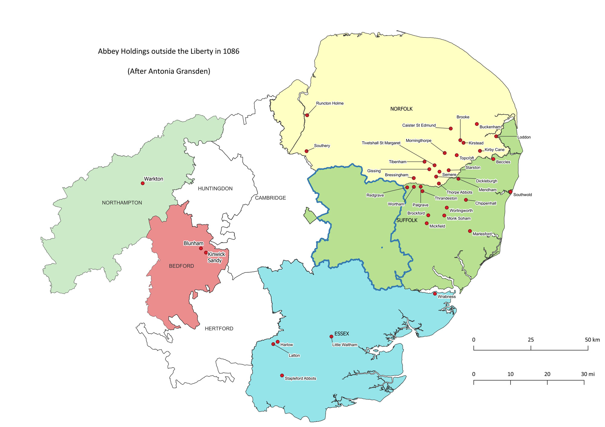 Held in 1066Holdings of the Abbey of St Edmund in 1066 - Outside the Liberty of St Edmund. This map is based upon those included in "History of the Abbey of Bury St Edmunds", by Antonia Gransden. The shaded counties are those where some holdings are located. |