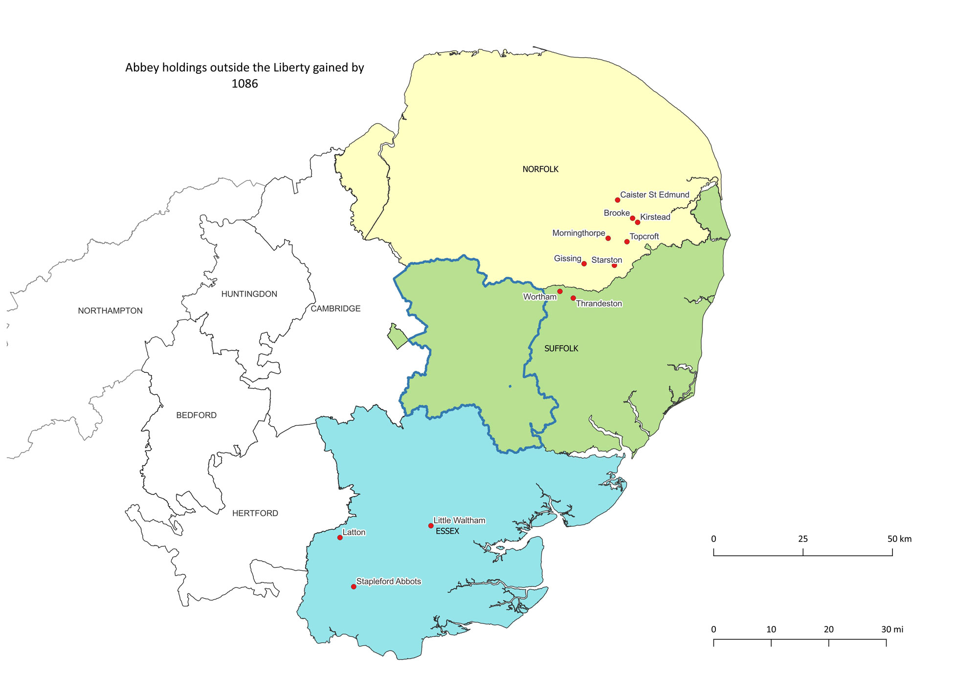 Gained by 1086Holdings of the Abbey of St Edmund gained between 1066 and 1086 - Outside the Liberty of St Edmund. This map is based upon those included in "History of the Abbey of Bury St Edmunds", by Antonia Gransden. The shaded counties are those where some holdings are located. |