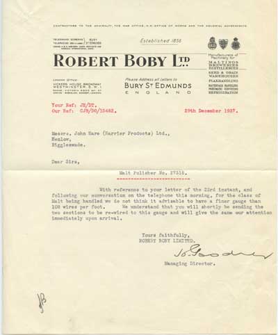|  This leter from Boby's is dated 1937. It is advice to a customer about the gauge of wire to be used in his malt polisher. |