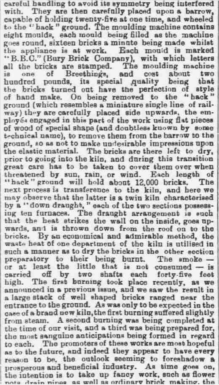 In the Bury Free Press for 10th March, 1900, the company were advertising as follows:- "Wanted, good steady Brick Yard Hands- Apply Manager Bury Brick Co., Nowton Road, Bury St Edmunds."