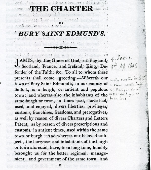 6 and 7 These latters patent make the inhabitants into one corporate body, "The Alderman and Burgesses of Bury Saint Edmunds".. |