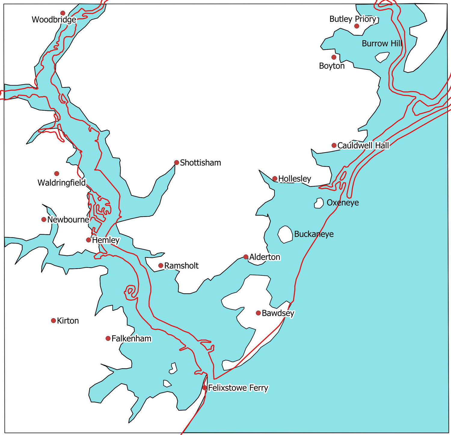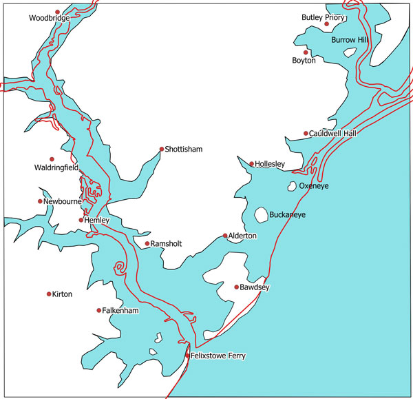 The The River Deben and the coastline by around 1600. This is Figure 31 in the SIAH article. While deposition has encouraged further land reclamation, Bawdsey Cliffs have experienced erosion. Goseford port is now associated with the Deben and Bawdsey Fleet area as Oxeneye has become cut off from the sea. |