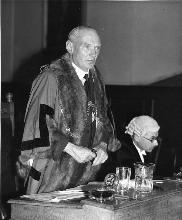 Alderman R A C Olle, Chairman of the Watch Committee asserts that shopkeepers had an ancient right to set up a stall in the Market place. The Town Clerk believed that the Council had over riding authority over the issue. Alderman W T Porter, JP, sitting adjacent. |