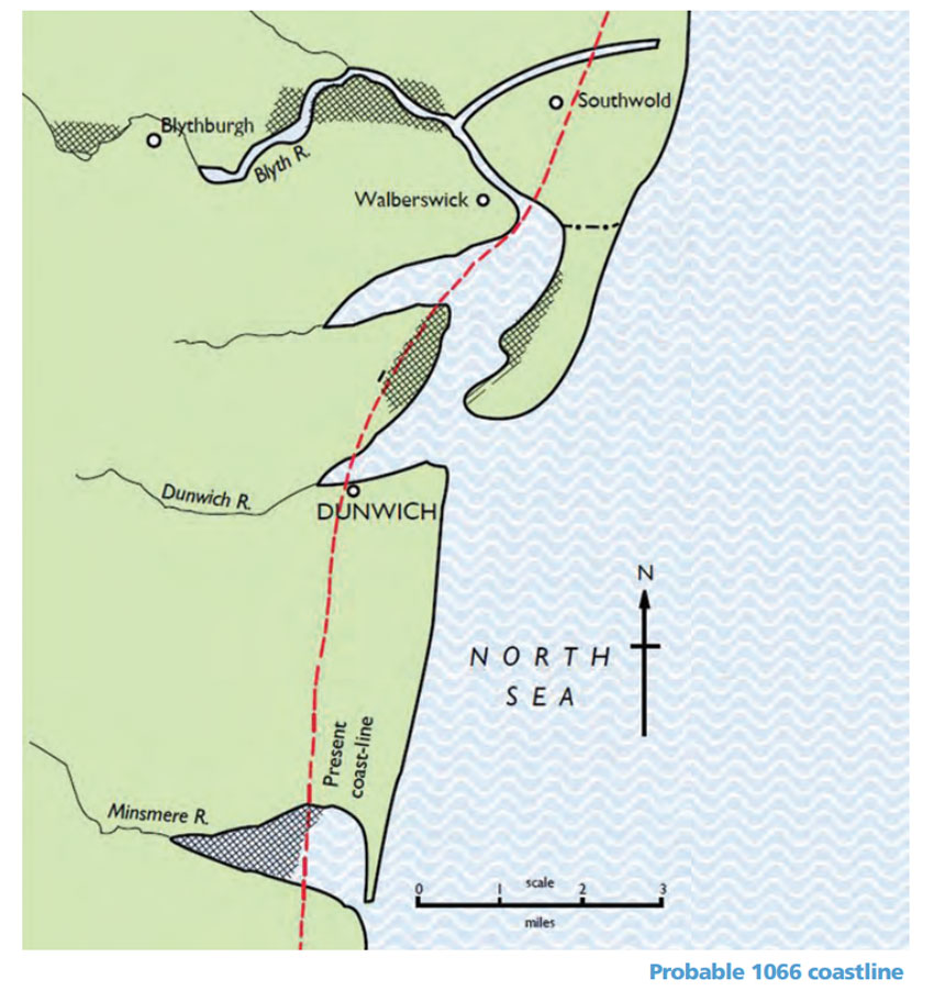 This map comes from the booklet "Southwold's Changing Fortunes". It shows a different view of the coastline around 1066 and demonstrates how the town of Dunwich commanded the entrance to the River Blyth at this time. From 1230 to 1408 Dunwich had charter powers to levy tolls on cargo ships passing upriver to Walberswick and Southwold. By about 1500 the shingle banks had extended and closed off the entrance to Dunwich and the people of Walberswick and Southwold had breached the shingle bank to drain the Blyth between those two towns. |
