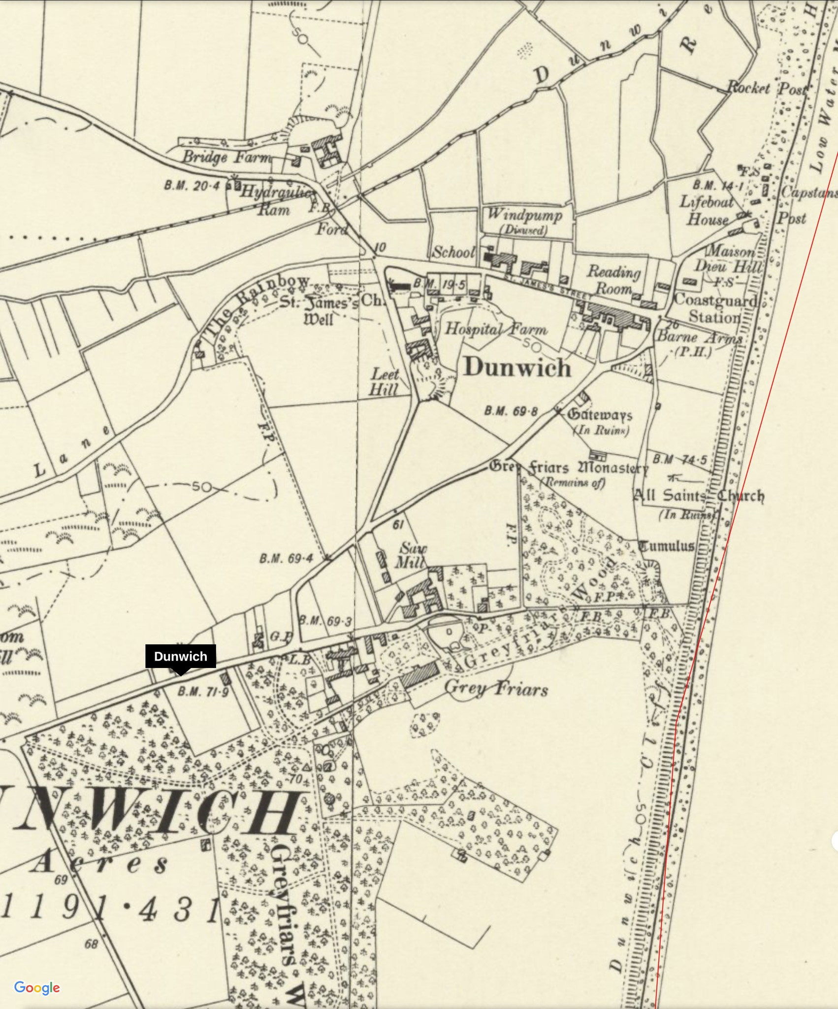 This Os map from the 1880s shows Dunwich at that time. All Saints church is shown in ruins, although it is now gone. |