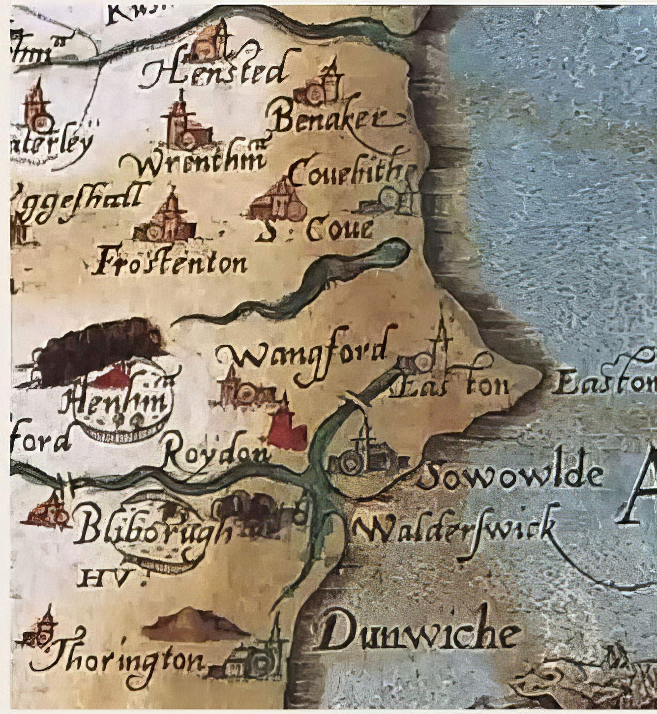 Saxton's map of Suffolk from 1575 still shows Easton Bavents Ness as a considerable feature. The River Blyth is now more or less in its modern position. |