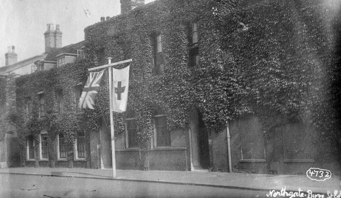 This Red Cross hospital was set up in Northgate Street, Bury St Edmunds. This photograph shows it during 1917. The Record Office description reads, " Photograph "Closed 2 January 1923" View of the hospital with flag pole flying Union Jack and Red Cross".