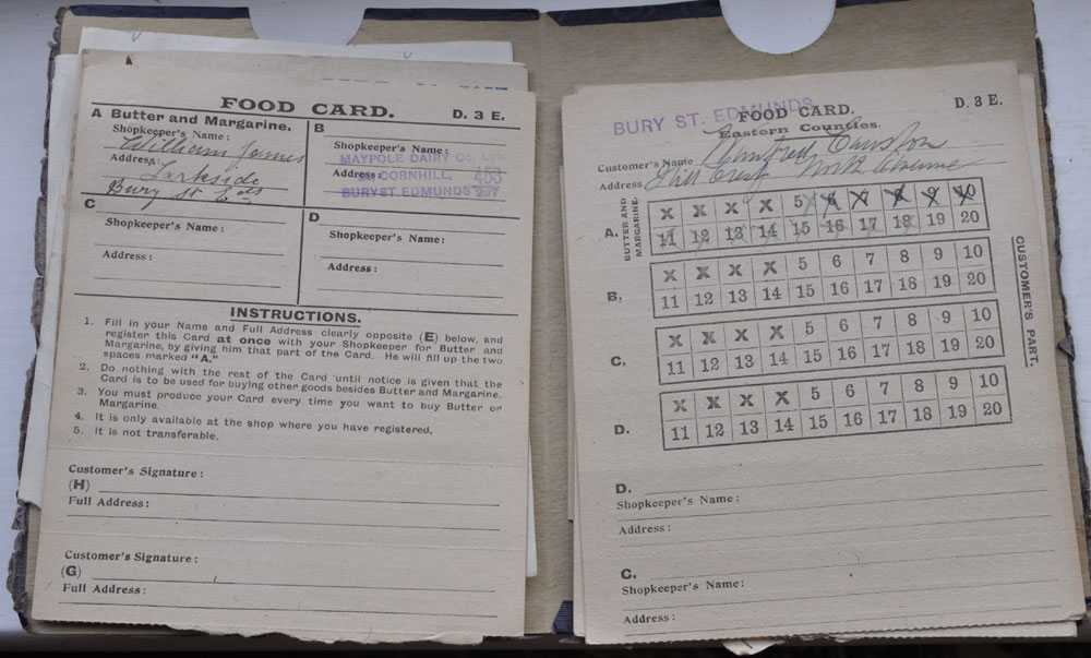 Butter and Margerine were also rationed so another card was issued for those commodities. Here the retailer is the Maypole Dairy on the Cornhill at Bury St Edmunds.Butter and margerine were rationed on 14th July, 1918, along with lard. Lard came off ration in December, 1918. Margerine was rationed up to 16th February, 1919, and butter until 30th May, 1920. (Martyn Taylor Collection.) |
