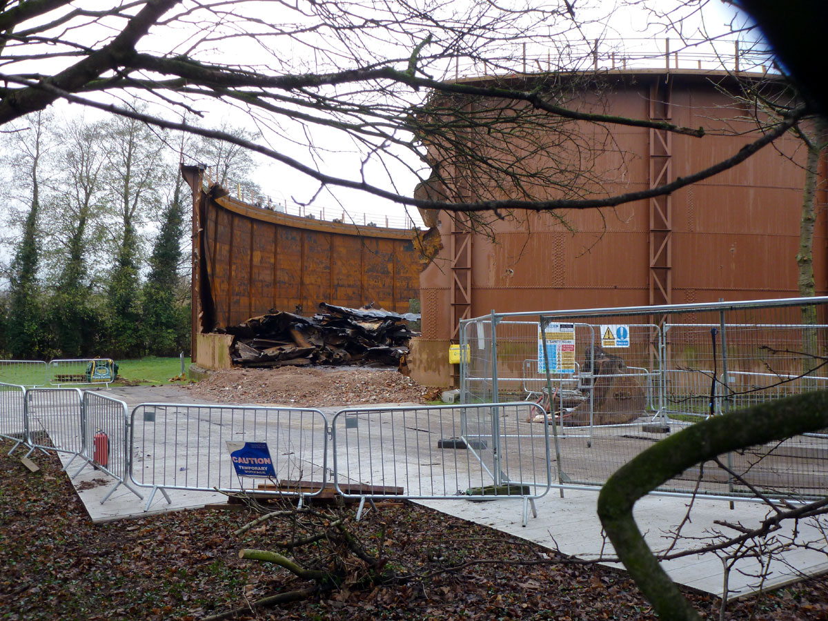 This distant view seen from the Station Hill in December, 2015, shows the cap of the gasholder in the process of removal. You will need to click on the image to see the larger version. |