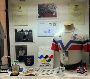 This case contains items from the Seoul Olympics of 1988. Click to see the adjacent case, with Atlanta 1996 kit. |