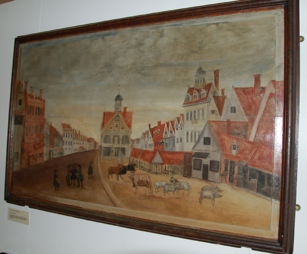 The artist here is not known, but this panel dates to around 1700. It depicts a time when the Cattle Market was located on the Cornhill, handily adjacent to the Butchers' Shambles, where the beasts could be slaughtered and the meat sold. |