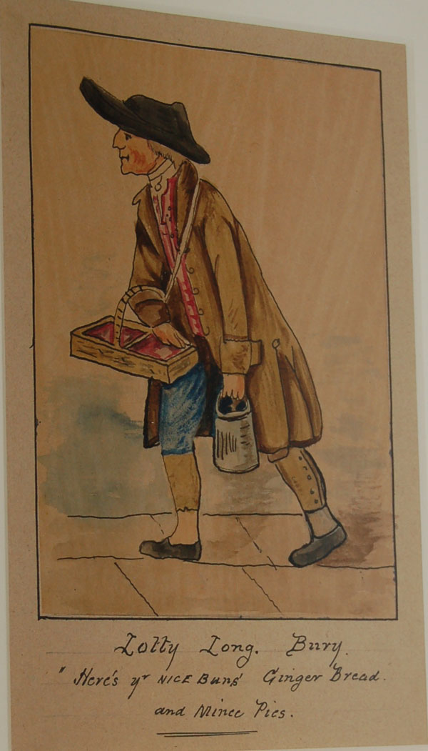 Moyse's Hall contains several Bunbury prints and drawings. This picture of Lotty Long is rather less grotesque than many of Henry Bunbury's caricatures. A street trader, she sold buns, gingerbread and mince pies around Bury. |