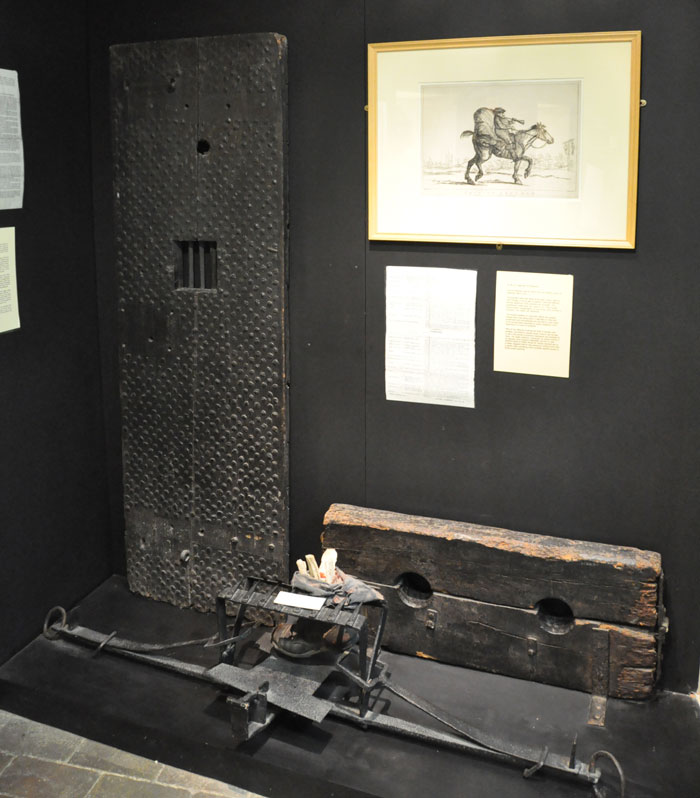 A cell door, some stocks and a man trap illustrate the hazards of a criminal career. |