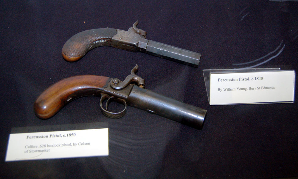 The lower pistol to the left is a .620 calibre boxlock by Colson of Stowmarket, dated 1850. The upper percussion pistol is by William Young of Bury, dated c1840. |