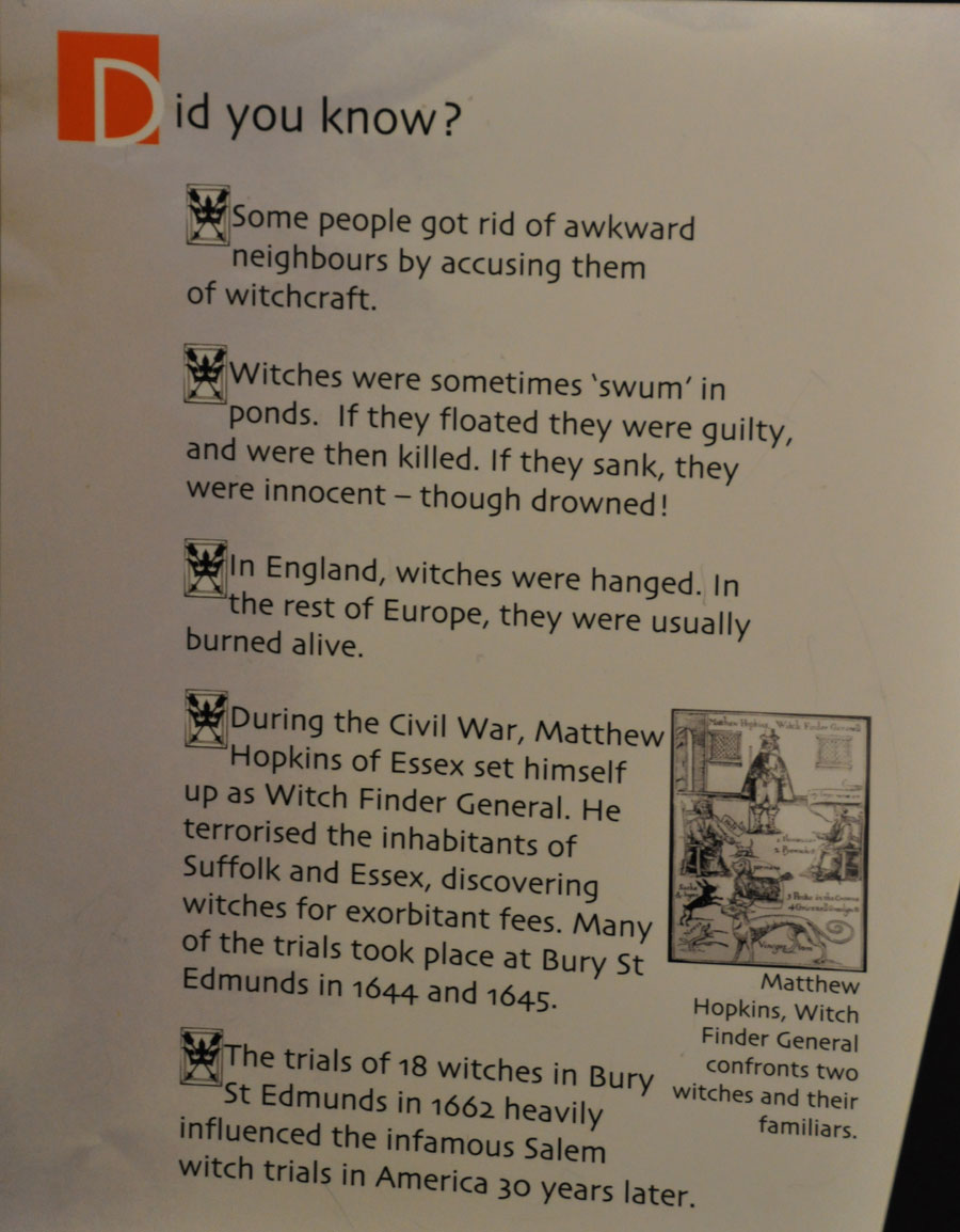 There were many books condemning the practice of witchcraft, and witch trials were the sensations of the day. The trial and execution of 18 witches in Bury St Edmunds in 1645, and of two women in 1662 at Bury, was echoed at Salem, in colonial Massachusetts, USA, in 1692. The Witchcraft laws were not finally abolished in England until 1736. |