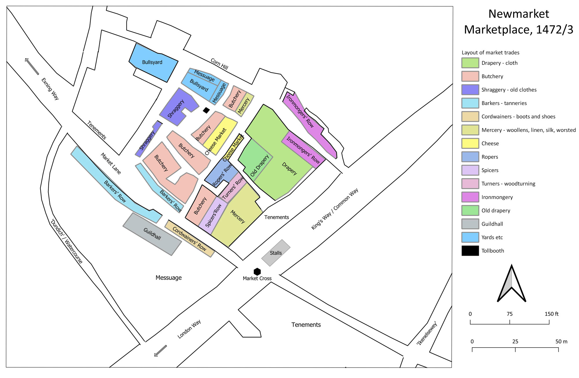 Conjectural layout of the market stalls and buildings. The comparative locations of each trade are taken from research by Dr Jo Sear on the manor account rolls for 1472/73. The plan is drawn by David Addy to place each trade within the form and layout of the market shown in the OS map of 1884.