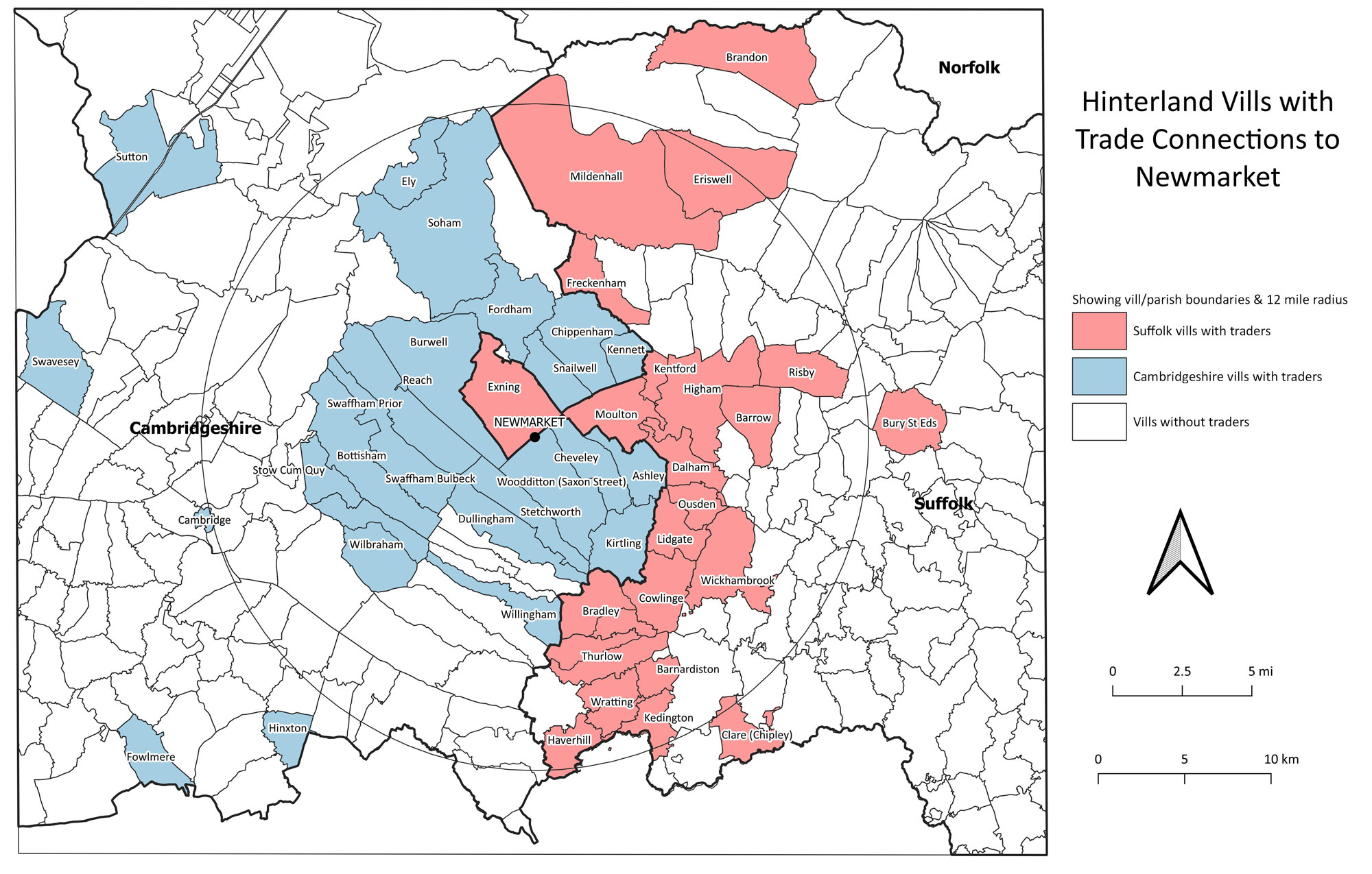 Showing named vills with sellers who traded at Newmarket. Although 41 out of the 61 total traders were within 12 miles of the town, the map shows that some traders were willing to travel well over 12 miles to trade at Newmarket.