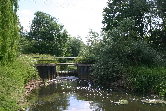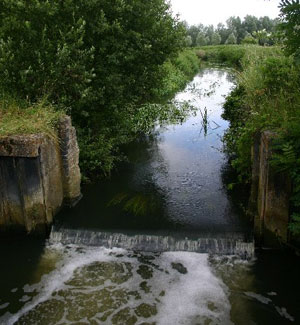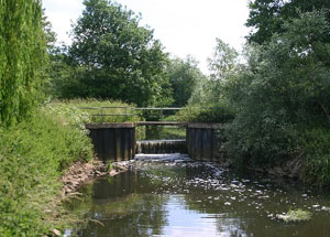 View upstream to the site of Hengrave Lock. These remains of a former lock are viewed from a footbridge over the river, which was formerly open to vehicles in the 1990s. TL 831 690 |