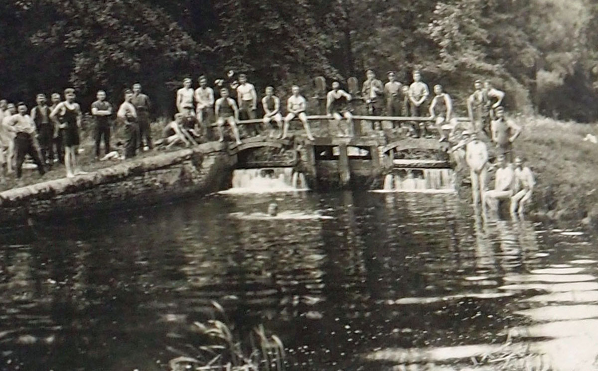 Soldiers enjoy a dip at Ducksluice at Fornham St Genevieve. This view was taken by Walton Burrell in August, 1915 |