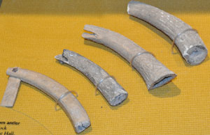 Anglo-Saxon homes had doorlatches which could be opened from outside by the use of these "keys". Made of antler and bone, they folded so they could pass through a small hole in the door, then fall open to lift the latch mechanism. |