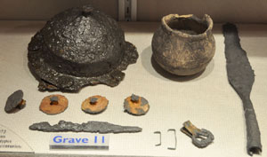 Grave goods from male burials, including Westgarth Gardens grave 49, showing 5th century objects. These include rounded shield bosses, spearheads and a knife. |