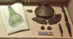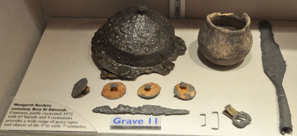 Grave goods from the wealthy male burial in grave number 51 excavated at Westgarth gardens in Bury St Edmunds in 1972. As well as the usual shield and spearheads, the grave contained an intact glass beaker, probably brought in from Kent. There was also a rare sword. |