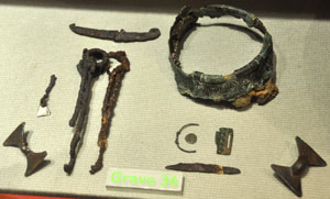 Unusual metal grave goods from the female burial in grave number 36 excavated at Westgarth gardens in Bury St Edmunds. The ring is a bronze mount from a wooden bowl. |