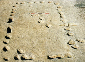 The Hall (H2) Once again, the decorative carving is not supported by excavated evidence. However, as a communal building and a focus for the family group, such decoration does not seem inappropriate. The design itself is from a die plate found on site. |
