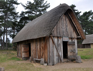 The Hall (H2) The timbers used were roughly squared by having their soft sapwood removed and the walls, rather than central posts, support the weight of the roof. Like the original buildings, the 1980 hall was repaired with wooden buttresses to give support. By 1999 this structure had become unsafe and was closed, and then demolished in 2000. Taking the building down provided more valuable evidence of the viability or otherwise of the construction methods used. By 2005 it was completely rebuilt. |