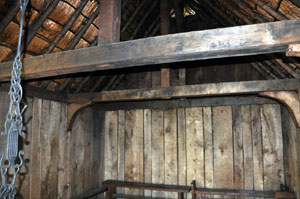 The Hall (H2) The roof of the hall is supported by four king posts resting on tie beams. In turn the tie beams are supported by these elbows. |