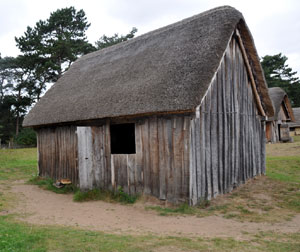 The Weaving House (SFB 20) This house was built from 1980 to 1983, and was the second two post type A house to be built. The main improvement incorporated was the use of pegs in the joints and planks, based upon the evidence of two iron spoon bits found on the site. |