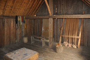 The Weaving House (SFB 20) View of the interior of the Weaving House. This building has been fitted out with looms as a weaving shed, as one of the burned houses contained the remains of several looms. Some of the buildings, like this one, appear to have been used for working in, and others for living in. A clay hearth was installed in 1983, but vibrations from floorboards cracked it. In 1992 a new hearth made of an oaken box replaced it, and is seen here.