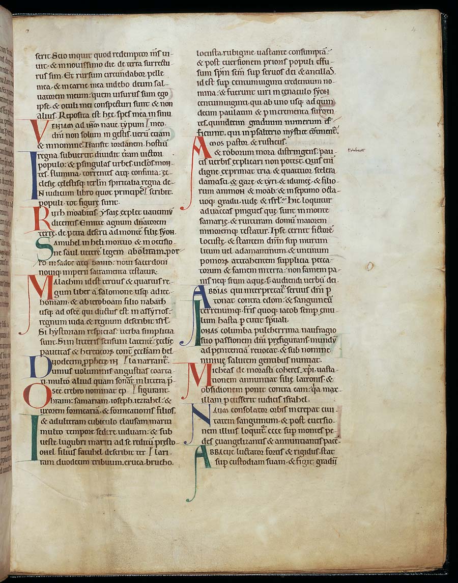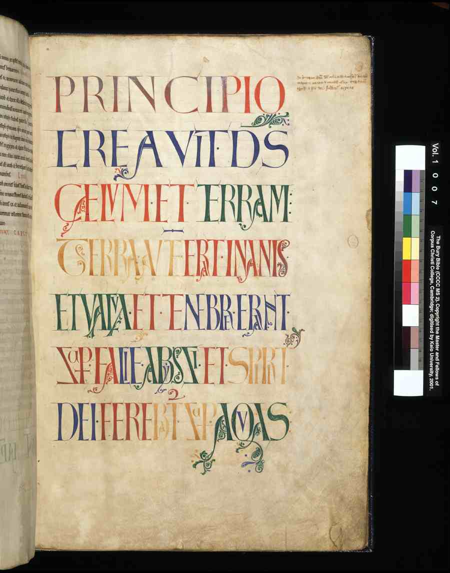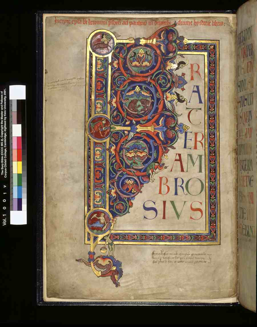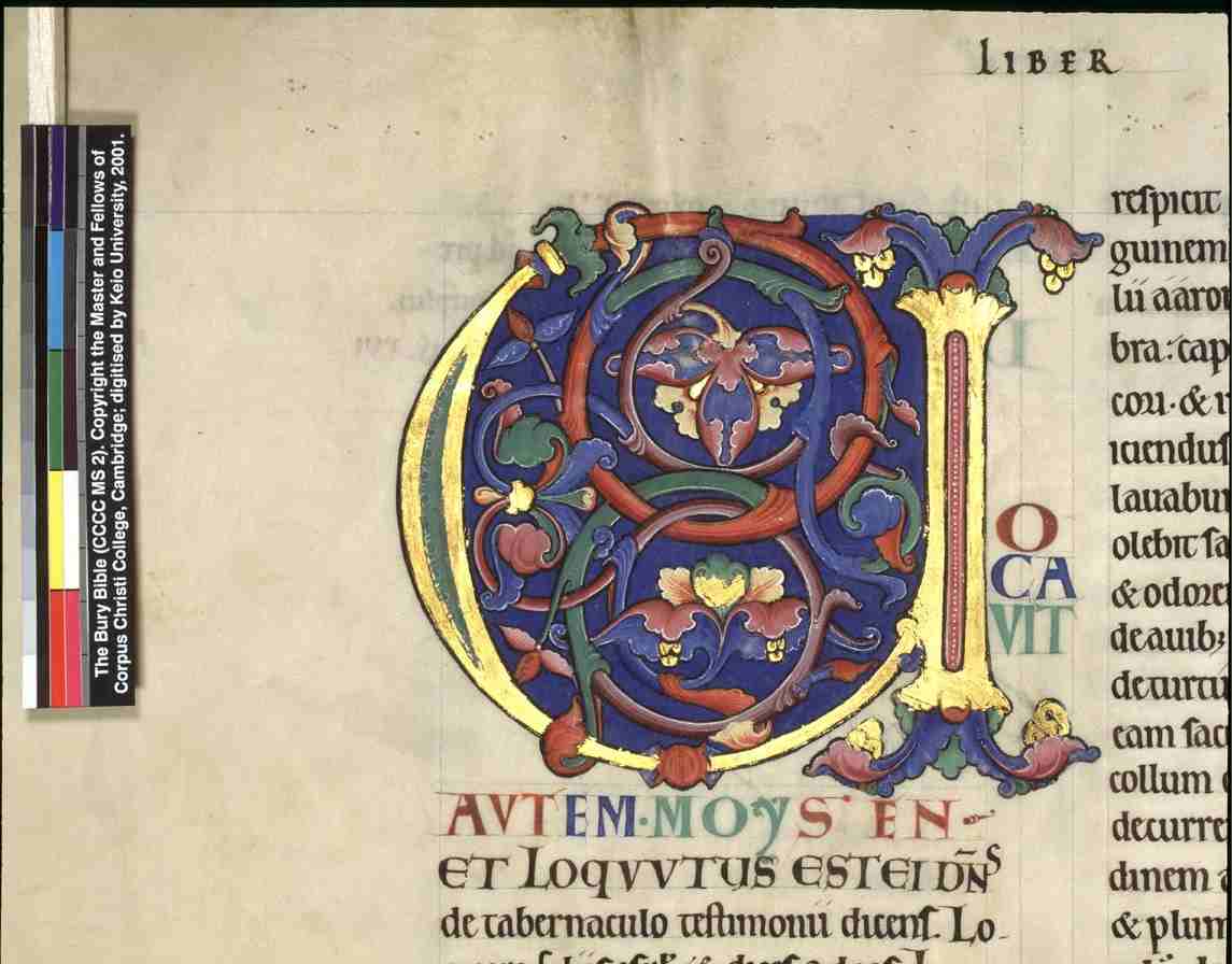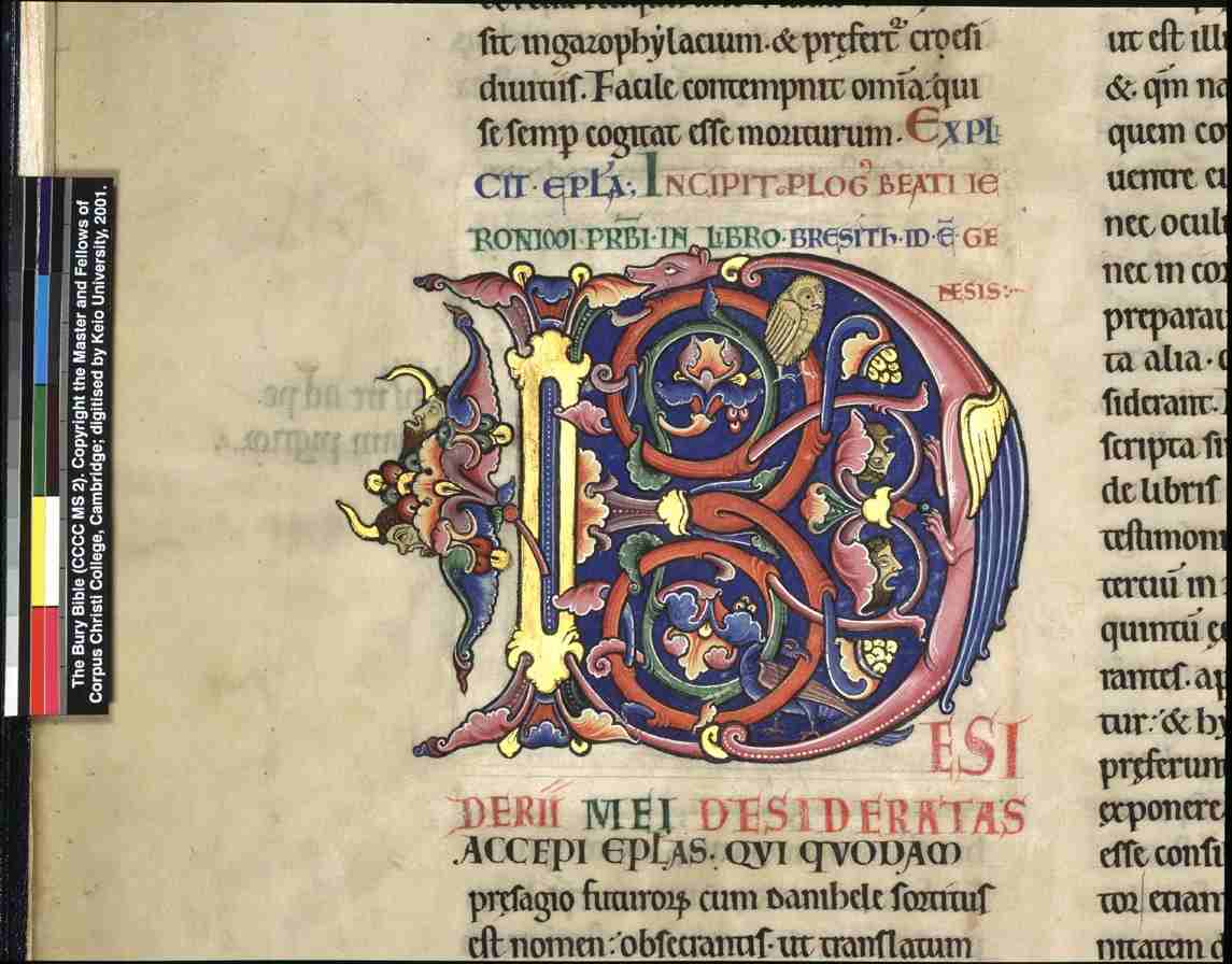 Cambridge. This picture gallery includes all the illuminated letters surviving from the Bury Bible. It does not include the hundreds of text only pages. More information is available in Moyses Hall Museum All images were digitised by Keio University at the Parker Library in 2001. |