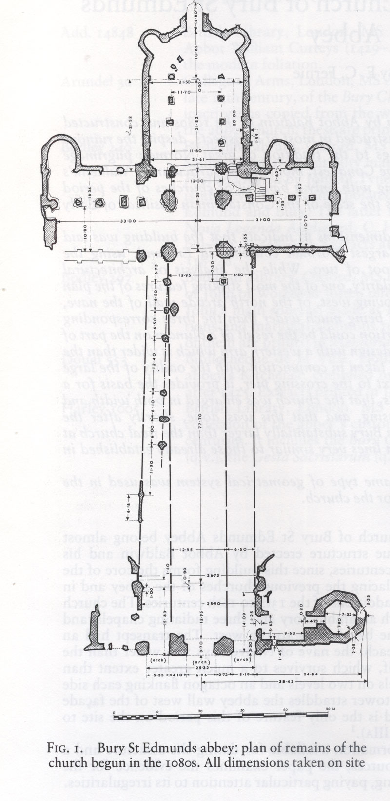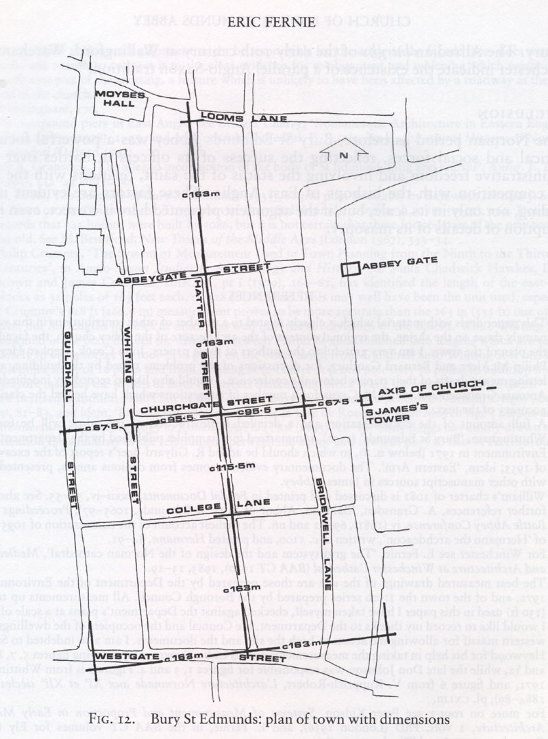 The illustration shows the old Saxon town layout as envisaged by Bernard Gauthiez before Abbot Baldwin embarked upon major construction works both at the monastery site and in the town.