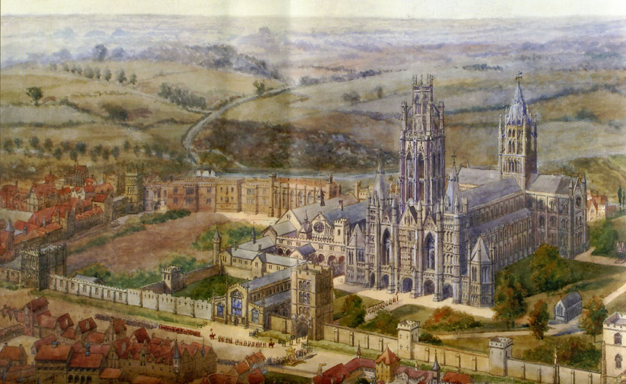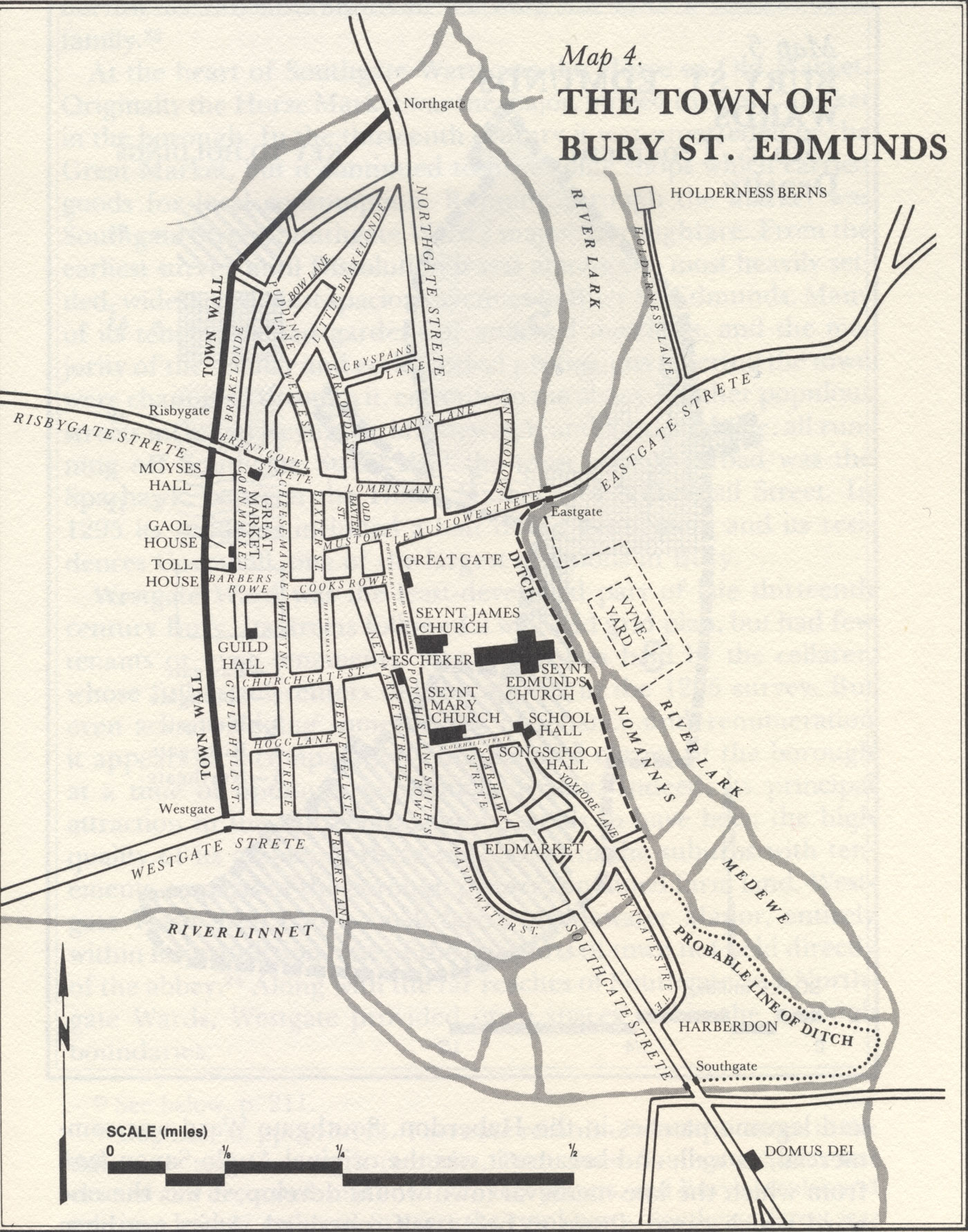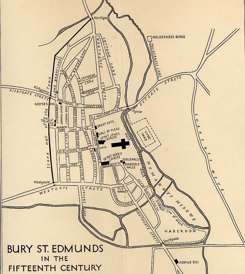 "Why need I in this place extol Bury at greater length? This only will I add, that the sun does not shine on a town more prettily situated, so delicately does it hang on a gentle slope, with a little stream flowing on its east side, nor on an abbey more famous, whether we regard its endowments, its size, or its magnificence. You would aver that the Abbey was a town in itself; so many gates has it - and some of them are even of bronze - so many towers, and a church surpassed by none, under whose shadow, in the same churchyard, stand three more of the most excellent design. The streamlet, which I just now mentioned, flows through the midst of the abbey precinct, gaining access thereto by a double bridge vaulted over it."