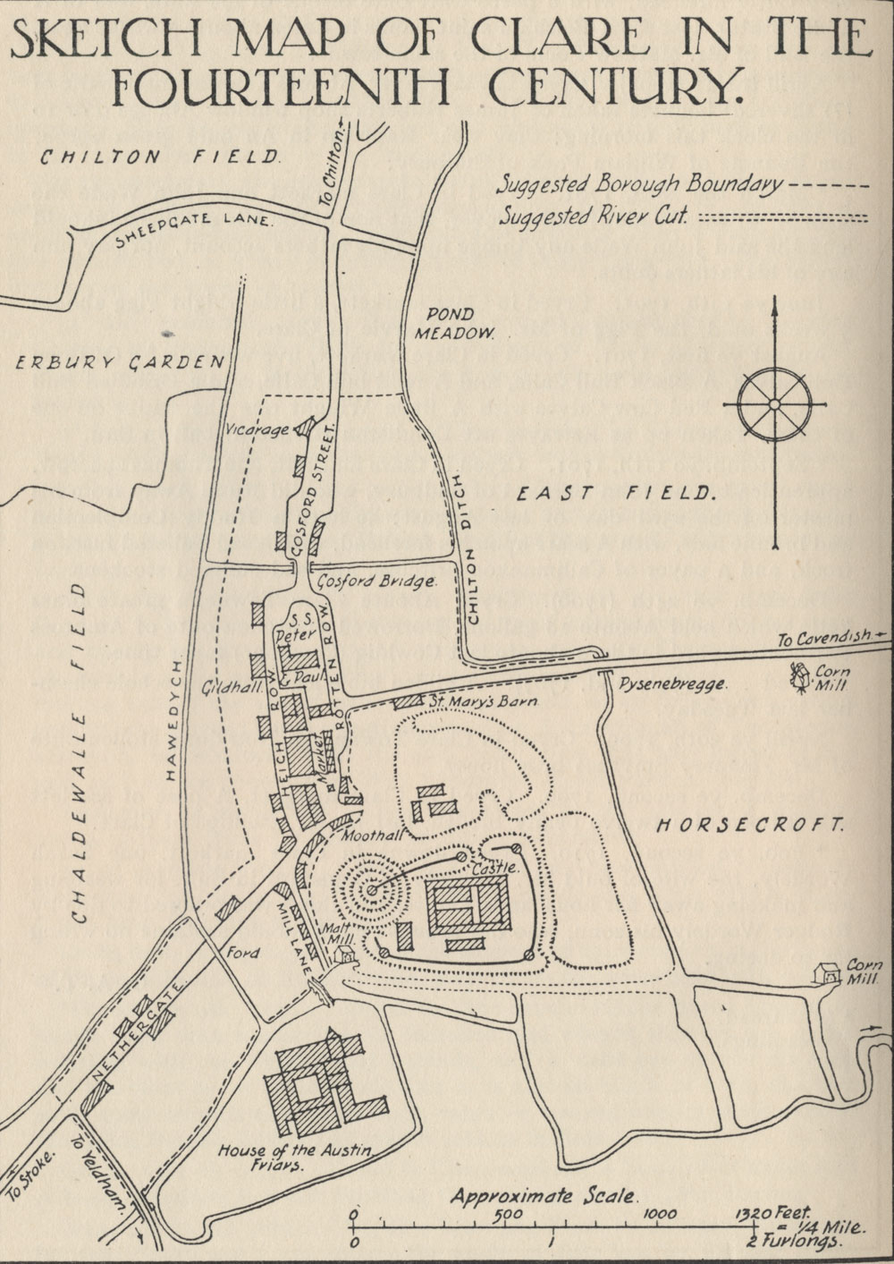 The Friars Eremites of the Order of St Augustine were also known as the Austin Friars, and Clare Priory was to be their first step into England. Clare became the mother house of the Order in Britain. Until 1124 Clare castle had contained a Benedictine Priory, but in that year it was removed to Stoke by Clare. The Austin Friars got their own premises just outside the castle.