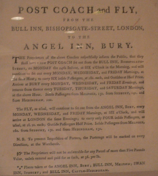 The lobby of the Angel Hotel still displays this advertisement for a new Post Coach service from London to Bury. The display dates this document to 1817. The advert features the new Post Coach, but also confirms the arrangements for the existing coach, known as the Bury Fly.