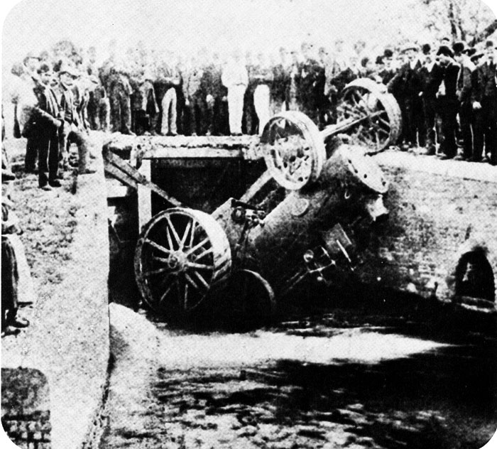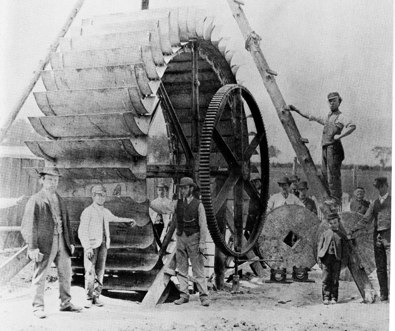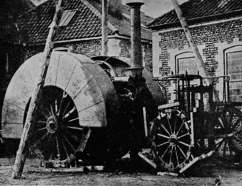 This waterwheel was built in or about 1899, by the firm of Joseph Bridge at their Victoria Street works in Bury St Edmunds. It was for use in a watermill, as can be seen by the display of millstones in the picture. Several watermills were still working along the valley of the River Lark, and Pakenham and Ixworth both had watermills still operating on the River Blackbourne at this time. Some time around 1890, the Chimney Mills water wheel had been replaced with a 20 foot diameter steel wheel made by Woods and Cocksedge of Stowmarket.