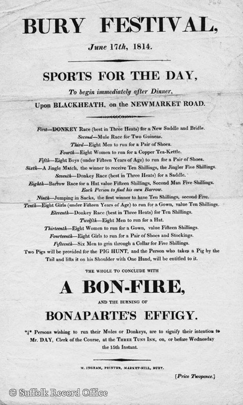 To celebrate the ending of the war the theme for the Bury Festival was the burning of Napoleon's effigy. The picture shows the notice giving details of the sports for the Bury Festival on 17th June 1814. It lists the old style races - the'Jingle race' and pig hunt. The prizes on offer were pairs of shoes; a copper kettle; saddle; hat; and money. The day ended with a bonfire and the burning of an effigy of Bonaparte.