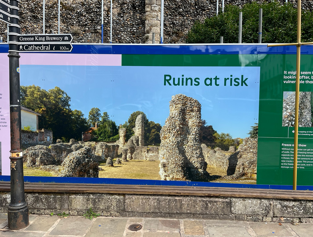 In April, 2024, the Abbey of St Edmund project was awarded a £730,000 grant by the National Lottery Heritage Fund. The project aims to conserve and protect the ruins; build a visitor centre, west cloister, and network of footpaths; and use digital technology to provide exciting interpretation for all ages and interests. The initial work included these colourful information panels erected on the Angel Hill frontage of the Abbey Gardens to inform the public of the works to be undertaken.