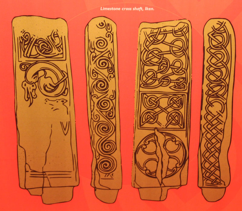 No trace remained of the well established monastery at Iken until 1972, when Dr Stanley West was excavating around the church at Iken. He discovered and identified the shaft of a 9th century cross which had been re-used in the fabric of the later church. It may be that the cross was erected following an attack by the vikings and the destruction of the minster. It was the practice to mark a site where a church and altar were removed by the erection of a cross. The Iken Cross was very unusual for East Anglia. It was probably brought from Mercia, and was carved on all four faces, and originally 3 metres tall. Earlier wooden walls were found below the Norman walls, together with remains of severed limbs. St Botolph's remains continued to lie at Iken until the late 10th century.
