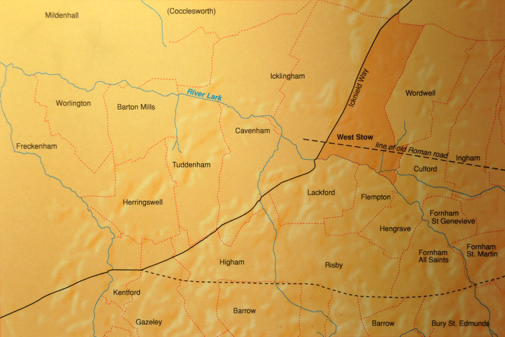 West Stow, sitting in the centre of the Lark Valley, was one of a number of similar 'villages' extending from the three round the later Bury St Edmunds to Mildenhall on the fen edge. The Blackbourn valley to the north-east has a similar distribution of sites. They are spaced out along the river banks with territories extending behind. Beyond these settled valleys, central Suffolk, a region of heavy, damp clay was returning to dense scrub and forest after the collapse of Roman settlement. This area was not occupied by the earliest Anglo-Saxon settlers. To the east, settlement penetrated the lighter sandlings of the coastal region much as in the west. To the west and south the river systems of Cambridgeshire were densely settled by Anglo-Saxons and were clearly related by their possessions to those in Suffolk.