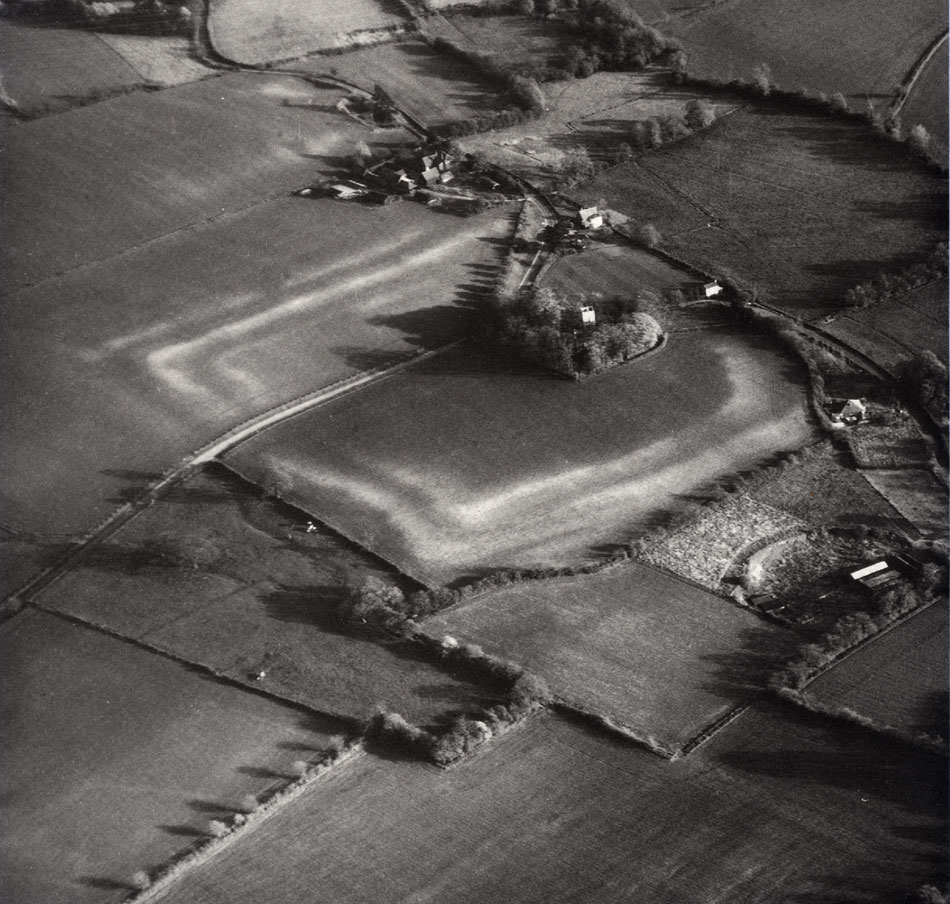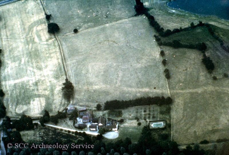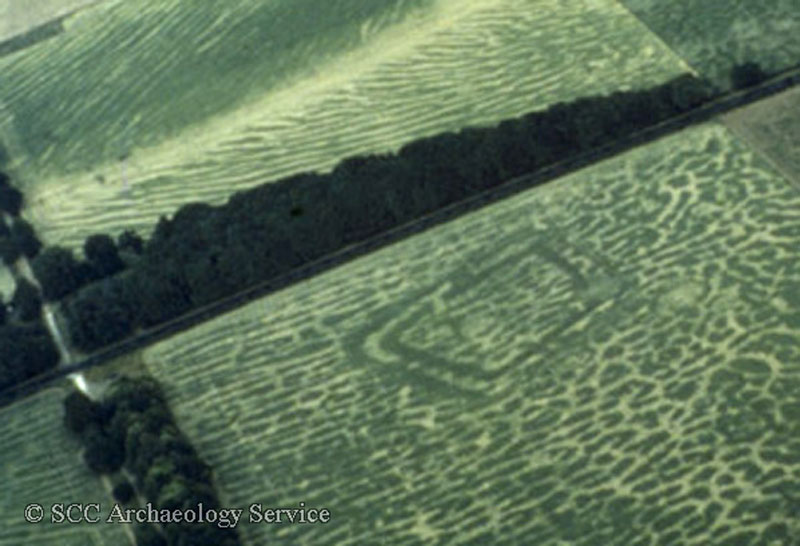 An Iceni iron age fort has been identified at Barnham surrounded by ditches and ramparts. Measuring 105 by 77 yards, it is rated as a small fort by iron age standards. The ditches were 23 feet wide and 10 feet deep, and the ditches were built between 180 BC and 20 AD. This aerial view shows the dark cropmark of a double-ditched trapezoidal enclosure. A small excavation in 1978 showed that it dates from around 100 BC and may have had a religious rather than a military function