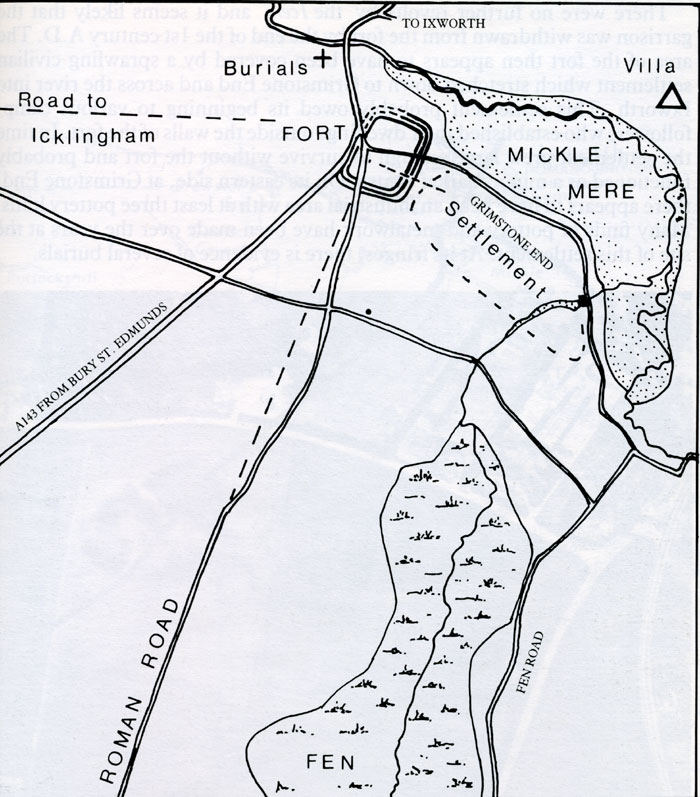 A sprawling half mile long Romano-British settlement possibly known as Camborito had been long established at Icklingham, and a Roman villa has also been identified there. Finds have been made here over many years and four lead water tanks have now been discovered in Icklingham bearing Christian symbols. In 1974 an apparently Christian cemetery was found with a possible Christian chapel.