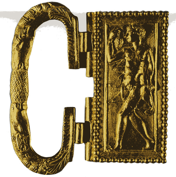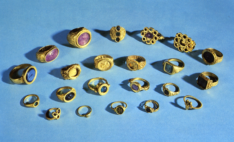 Some time between 390 and 400 AD the so-called Thetford Treasure was deposited in the ground by its owner. This hoard was discovered in 1979 at Gallows Hill, in Thetford, on the site where the Travenol factory now stands. The objects of both gold jewellry and 36 silver spoons, included 22 ornate gold rings, bracelets, necklaces and a great gold buckle. They appear unused, as if they were the stock of a high class jeweller. Inscriptions on the spoons are pagan, dedicated to the god Faunus.
