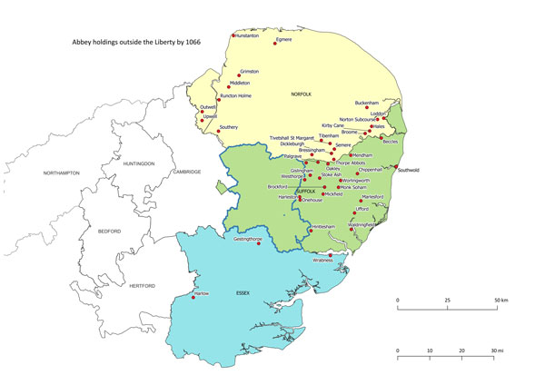 Held in 1066Holdings of the Abbey of St Edmund in 1066 - Outside the Liberty of St Edmund. This map is based upon those included in "History of the Abbey of Bury St Edmunds", by Antonia Gransden. The shaded counties are those where some holdings are located. |