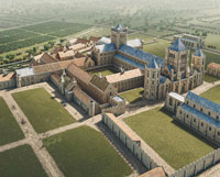 The new digital reconstruction images of the Abbey were researched by Stephen Brindle and digitally modelled by Carlos Lemos, both of English Heritage. The final images were completed by Bob Marshall a graphic artist, working on this project for English Heritage. One visualisation of the abbey at around the year 1400 is shown here.