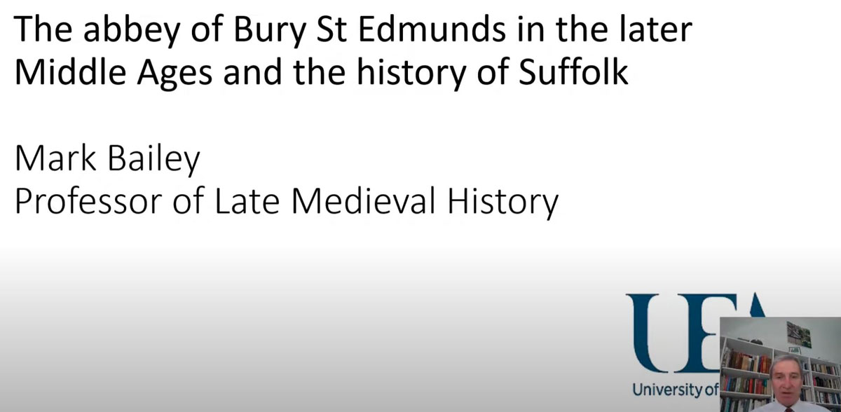 A month later, on 27th March, 2021 Professor Mark Bailey presented the fourth in the "From Rise to Ruin" series of online lectures. This was entitled the "Abbey of Bury St Edmunds and the History of Suffolk". Introduced by Dr Nick Amor, this lecture may be viewed by clicking on the link shown here:-