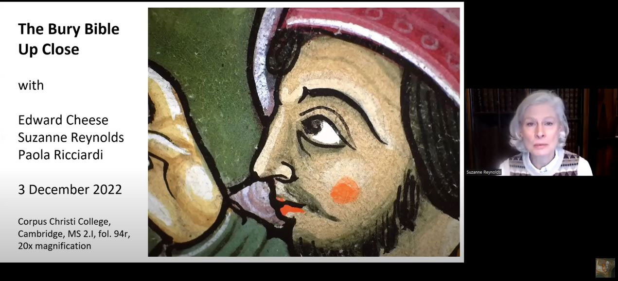 On 3rd December, 2022, The online talk entitled, "The Bury Bible close-up" was hosted by St Edmundsbury Cathedral and recorded on YouTube. Its presenters were Suzanne Reynolds, Edward Cheese and Paola Ricciardi speaking from the Founders Library at the Fitzwilliam Museum in Cambridge. Their analysis includes a forensic examination of the vellum pages, the techniques of preparation and the colours used and the making of inks.
